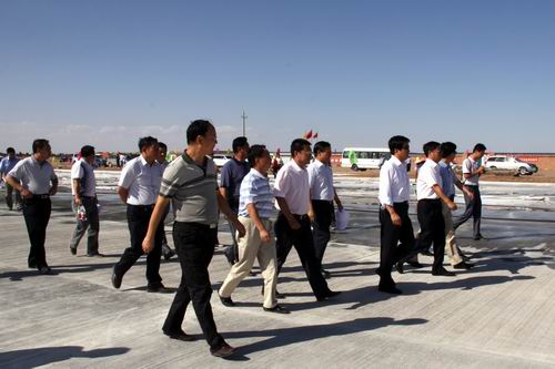 8月21日,由喬新山局長率領(lǐng)的民航西北管理局工作檢查組一行蒞臨金昌機(jī)場飛行區(qū)施工現(xiàn)場檢查指導(dǎo)工作。在飛行區(qū)停機(jī)坪建設(shè)工地,在了解到公司金昌機(jī)場項(xiàng)目部僅用了二十五個晝夜完成了總面積2.65萬平方米停機(jī)坪道面工程的情況后,對大家的辛勤勞動給予了充分肯定,并鼓勵廣大建設(shè)者繼續(xù)鼓足干勁、克服困難,發(fā)揚(yáng)求真務(wù)實(shí)、艱苦奮斗的作風(fēng),確保工程按期完工。