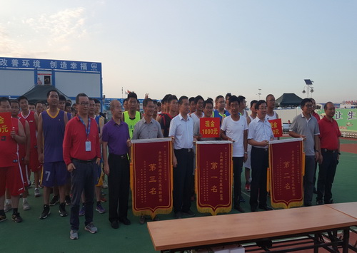 建設(shè)單位指揮部史副指揮長(zhǎng)、工程部趙部長(zhǎng)、監(jiān)理中企建發(fā)公司隋總為獲得冠軍、亞軍、季軍的籃球隊(duì)頒獎(jiǎng)