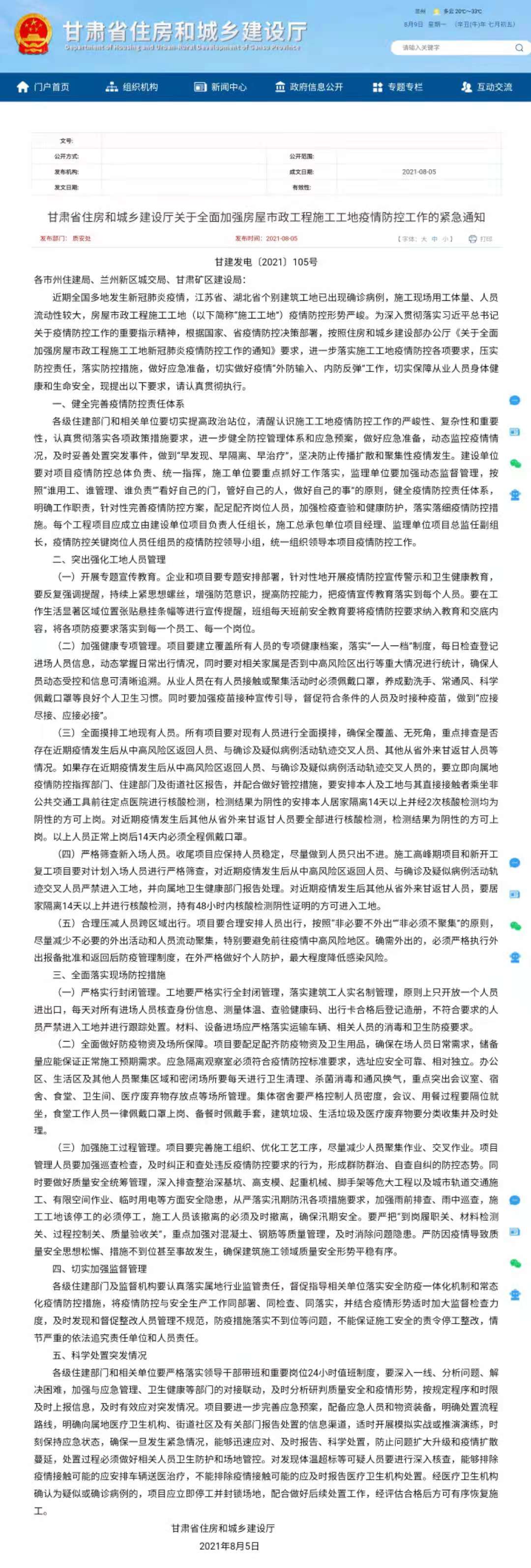 為深入貫徹落實習近平總書記關于疫情防控工作的重要指示精神,根據國家、省疫情防控決策部署,按照住房和城鄉建設部辦公廳《關于全面加強房屋市政工程施工工地新冠肺炎疫情防控工作的通知》要求,確保安全生產和正常施工生產秩序,現將《甘肅省住房和城鄉建設廳關于全面加強房屋市政工程施工工地疫情防控工作的緊急通知》轉發給你們,請各單位遵照執行。